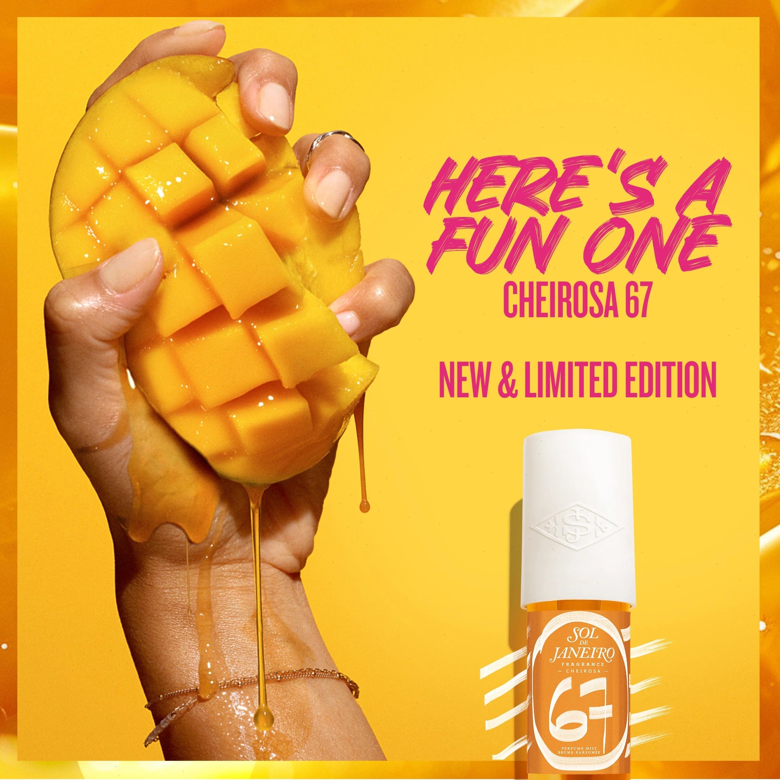 Mango-first, fun-always. Limited Edition Cheirosa 67 is the layered fruity amber perfume mist you asked for (literally). The hand-drawn sunray says it all. Bright and playful, we've captured the easy, unexpected energy of 67 in a bottle. Inside? A juicy burst of mango juice, pear nectar, black currant, and vanilla crème with a warm, intoxicating finish of amber woods. Senseless? Yes. Delicious? Absolutely.